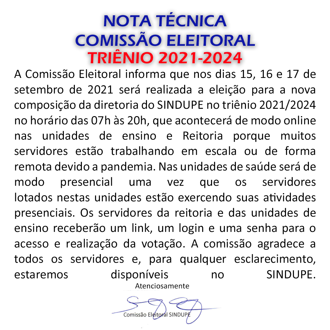 A comissão eleitoral para as eleições do SINDUPE para o triênio 2021/2024 divulgou a nota técnica e as instruções para os servidores que irão votar no processo eleitoral. Veja: