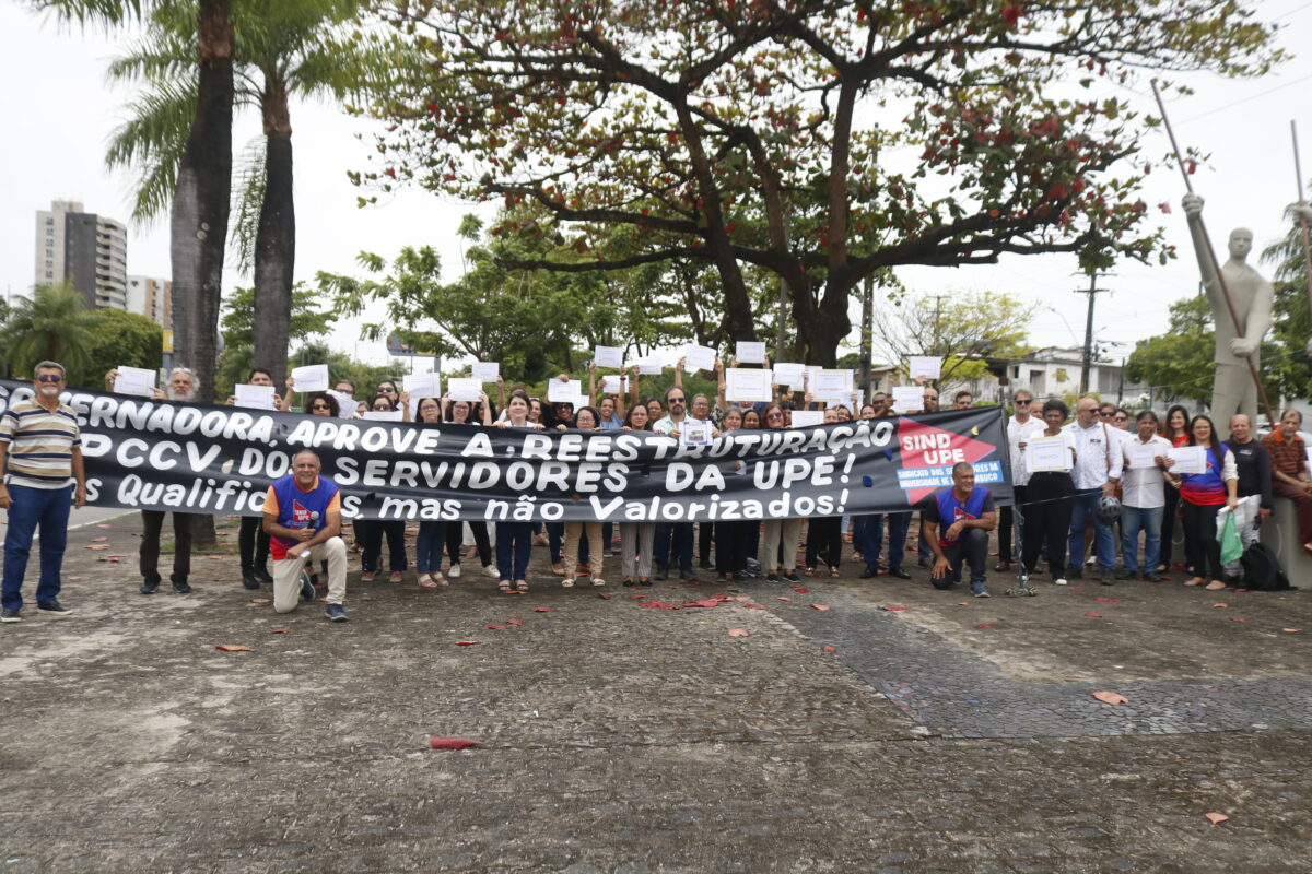 SINDUPE pede pela reestruturação do PCCV e chamada de concursados em frente a prédio da reitoria